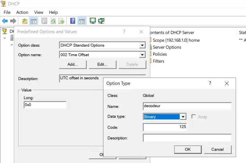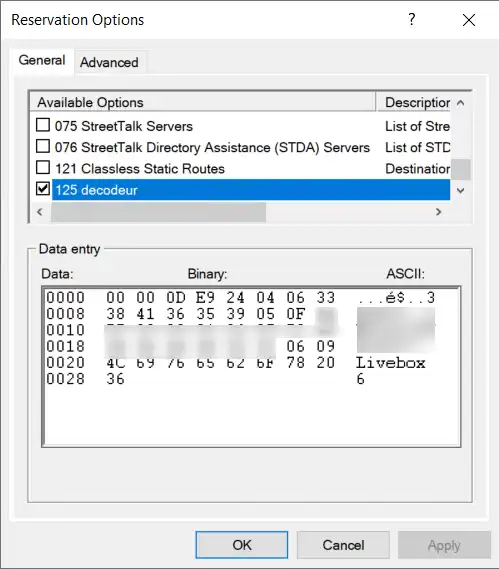 Set-DhcpServerv4OptionValue -OptionId 125 -Value $bytes -ReservedIP 192.168.1.100 # l'ip de votre décodeur